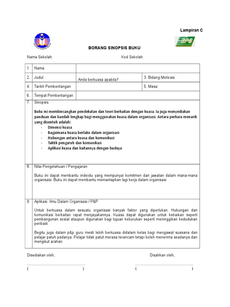 Borang sinopsis buku ldp ulasan buku splg borang sinopsis buku nama sekolah.